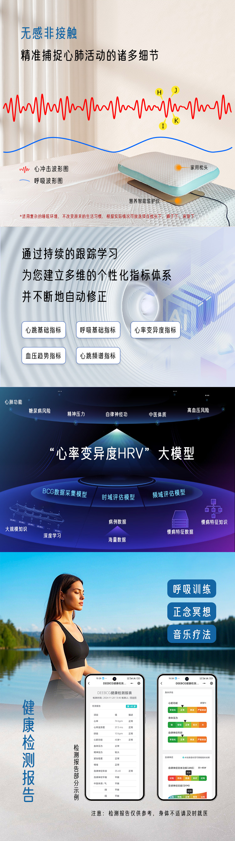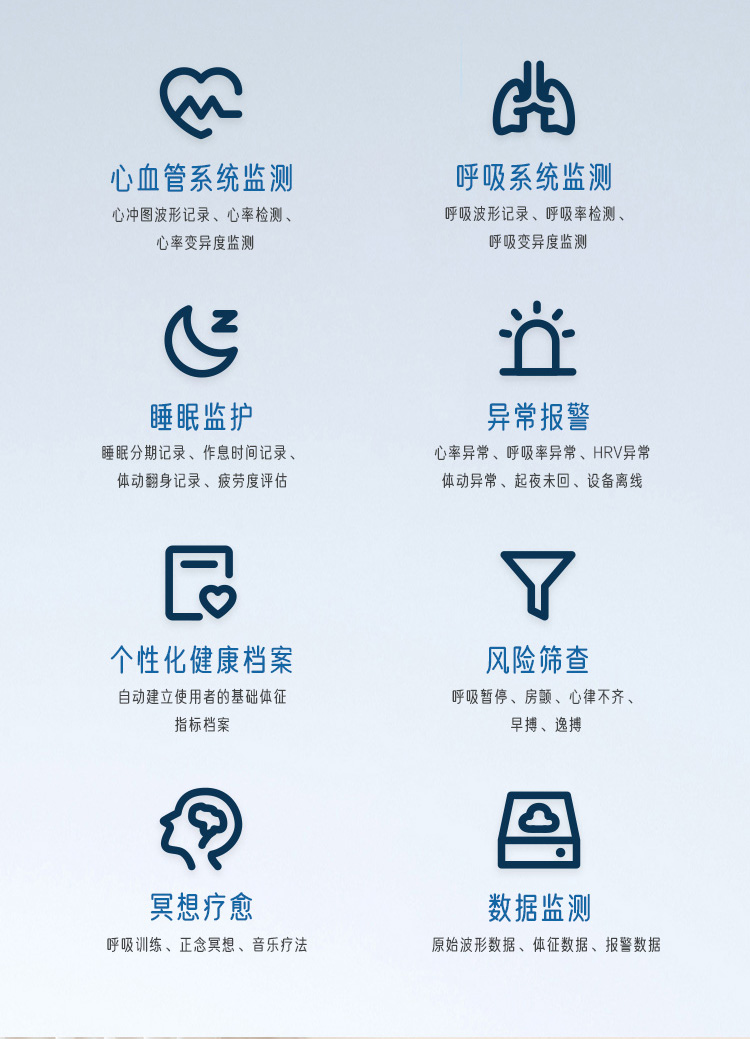 核心采用完全自主研发的极低频微震动传感器,拥有7项专利技术。国家《智慧健康养老产品及服务推广目录》、《中国康复辅助器具目录》、浙江《老年用品产品推广目录》产品。通过浙江省医疗器械检验研究院的《全项目(EMC)》、《全性能检验(EMC除外)》检验。